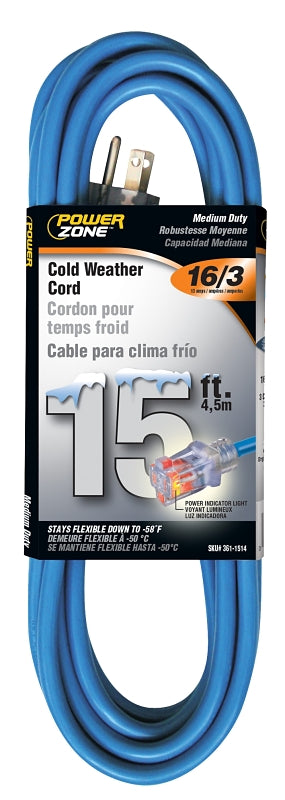 PowerZone Cold Weather Extension Cord provides outstanding performance in extreme climate conditions at temperatures from -58F up to +140F (-50C up to +60C). Cords provide superior resistance to moisture, ozone, cracking, and are outstanding in resistance to abuse, rough handling and wear. The Power Indicator Light in the connector shows when there is power through the cord.