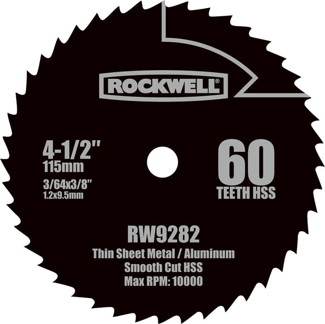 4-1/2 in high-speed steel saw blade. Fits the RK3441K (Orgill sku 992.4424) Compact circular saw. 60 teeth for cutting thin metal sheet, aluminum and copper. Max rpm: 10000.