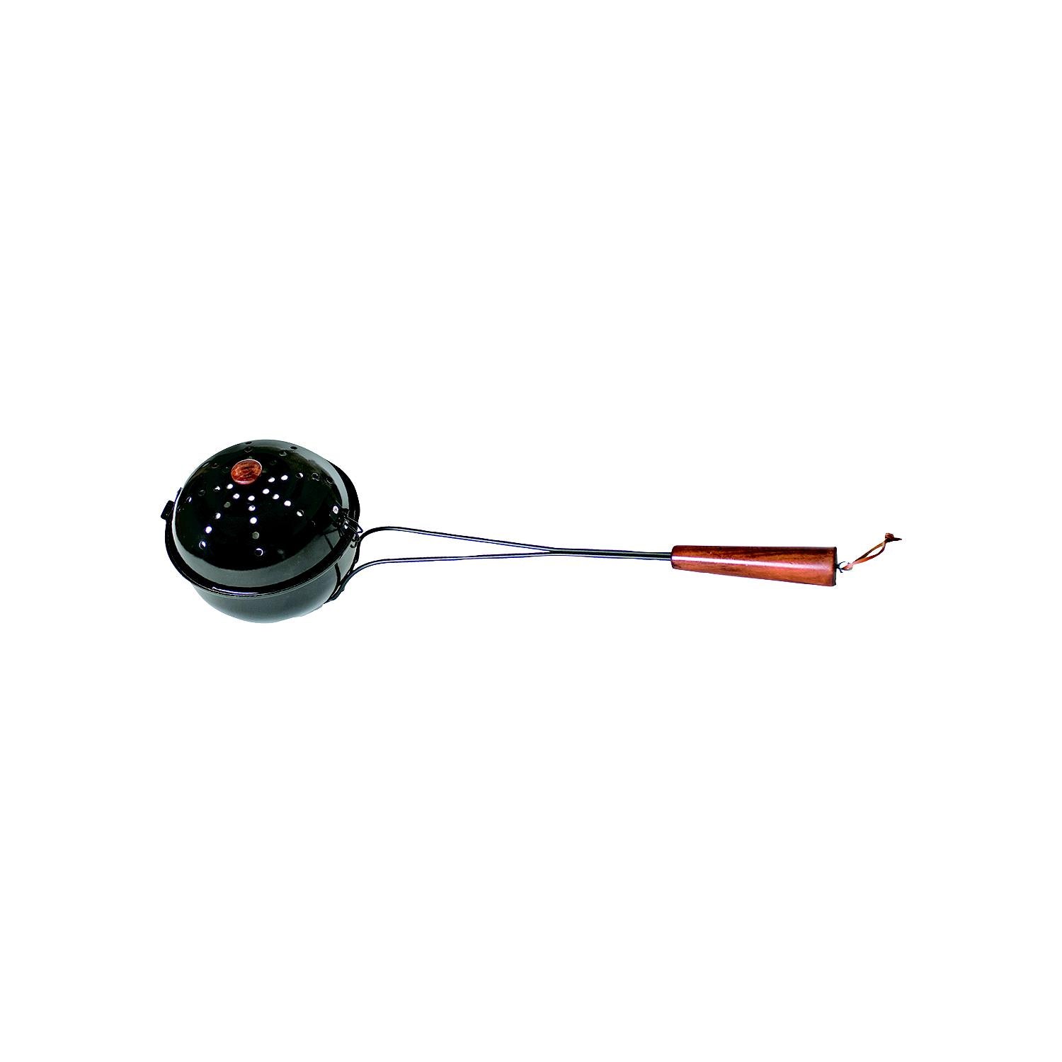 The round shape of the big bowl popper is made for serious popcorn action. The hinged lid works like a charm and holds 3 quarts. All steel construction features a BBQ grade baked enamel cooking surface. Solid wood handle stays cool when cooking over campfire or hearth. Fully assembled.
