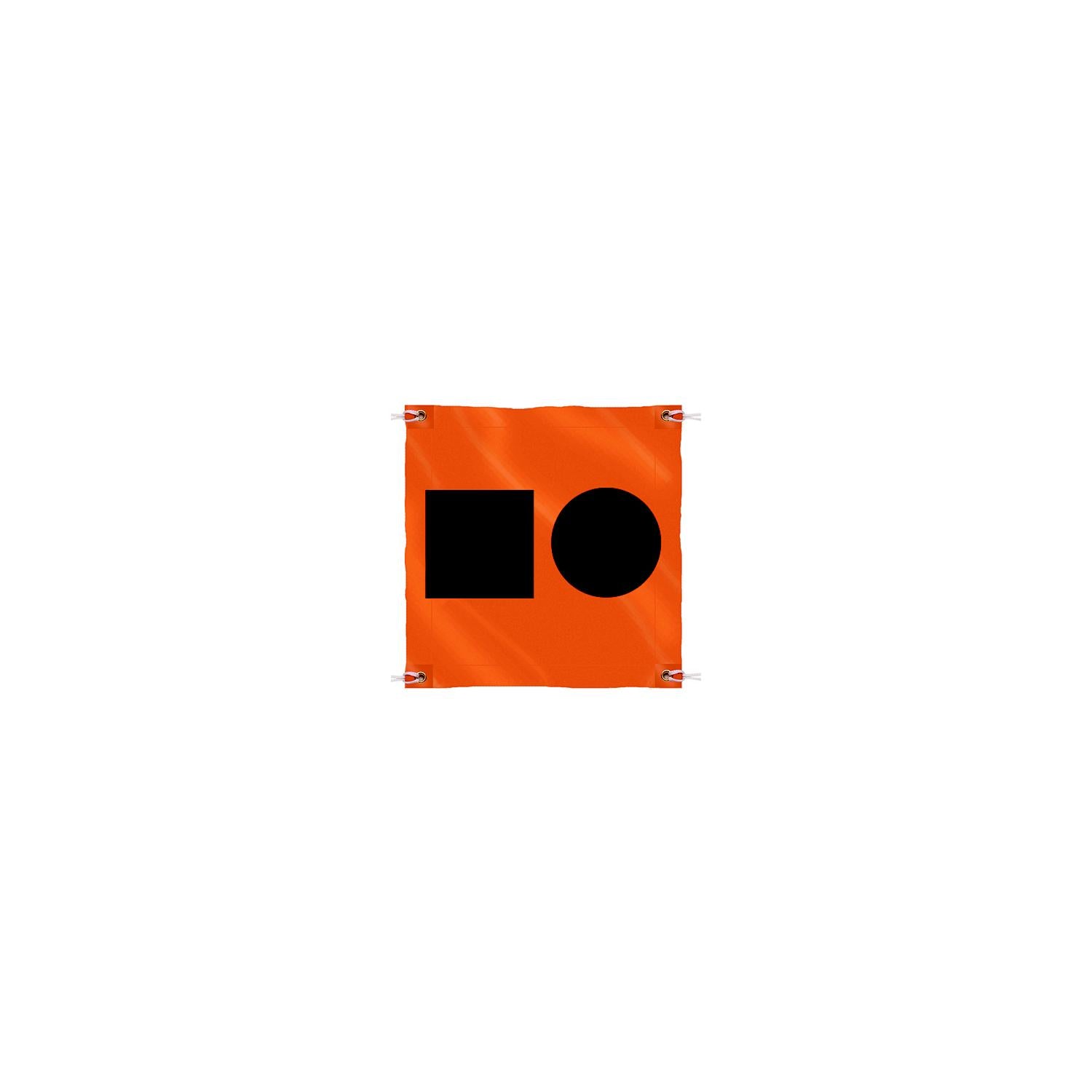 Black circle and square printed on international orange flag. PVC material. Reinforced grommets on each corner. Four pieces of line included for hold downs.