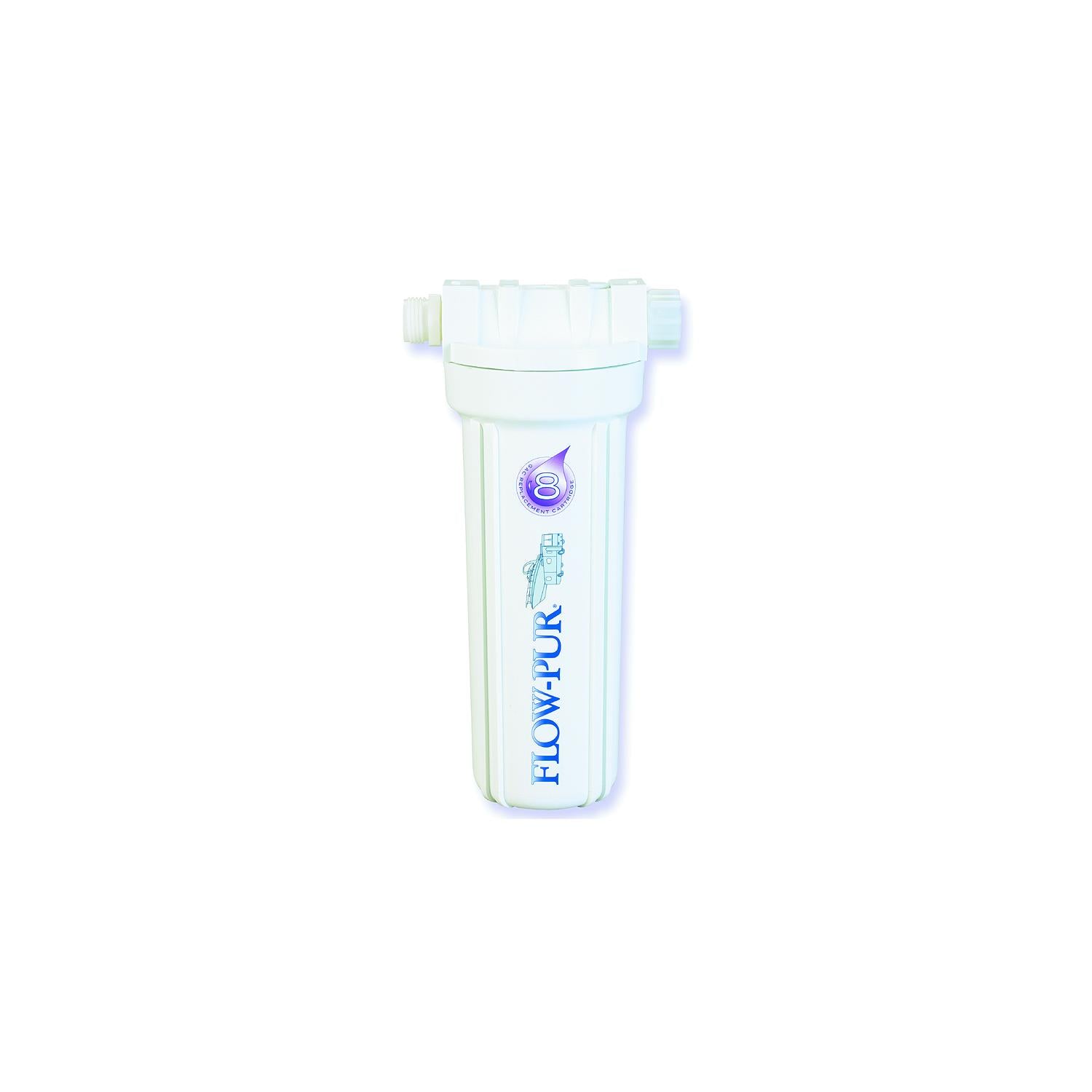Single Exterior Filter is equipped with garden hose fittings to install outside of RV/Boat to water supply hose. Cartridge #8 included with housing, bracket and wrench. Cartridge reduces chlorine, sediment, unpleasant taste, odors & voc's. Flow rate 2.5 GPM.