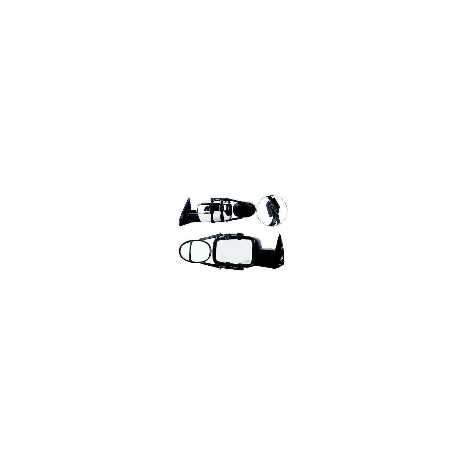 Universal dual lens towing mirror with ratchet mount system. Sold per pair.