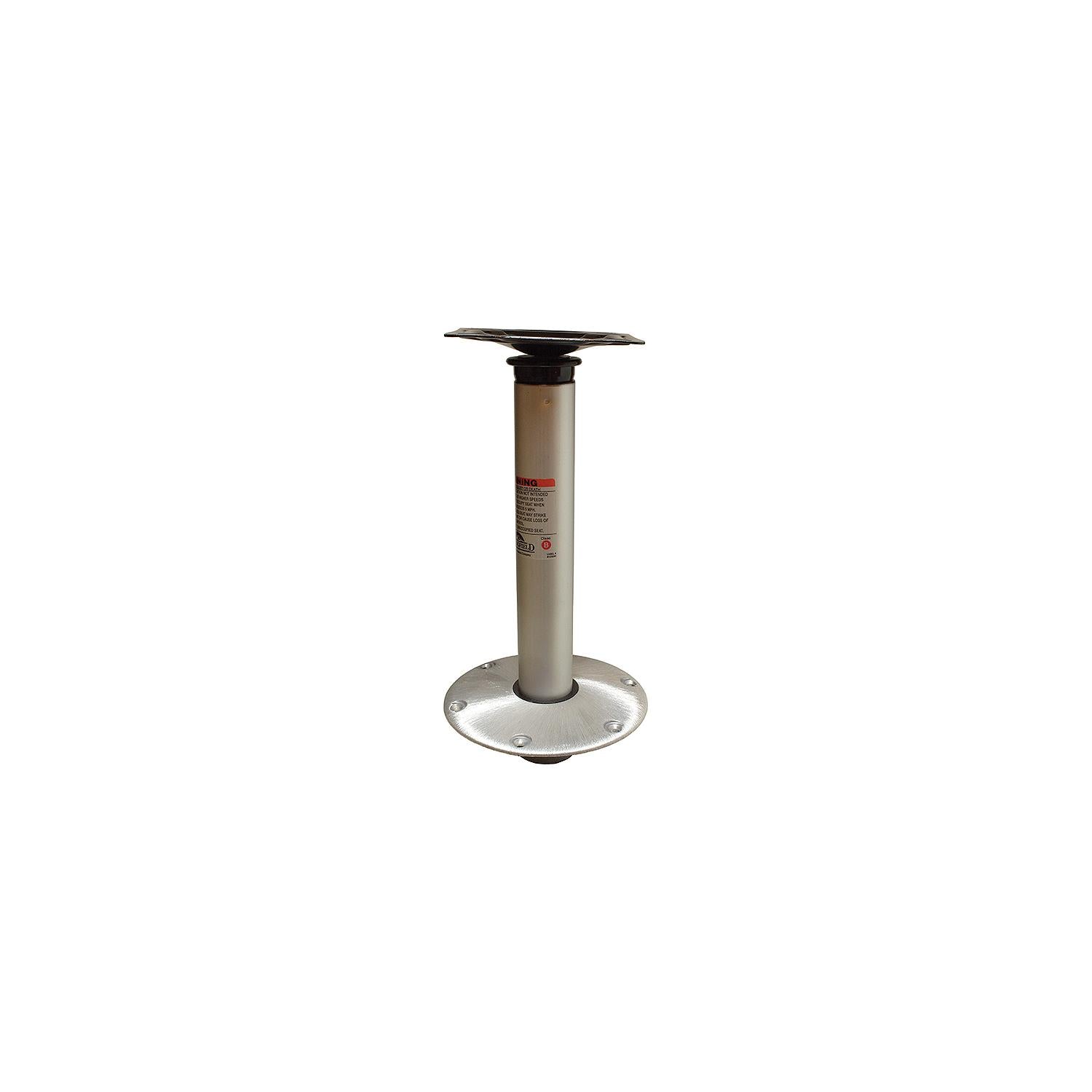 Hi-Lo 3 piece pedestal set with 9" diameter round base (1300751) and seat mount (1312700). This unique 2-position pedestal system allows the seat to be used in the full upright position while fishing or down in the lower position while boat is under way. Satin finish.