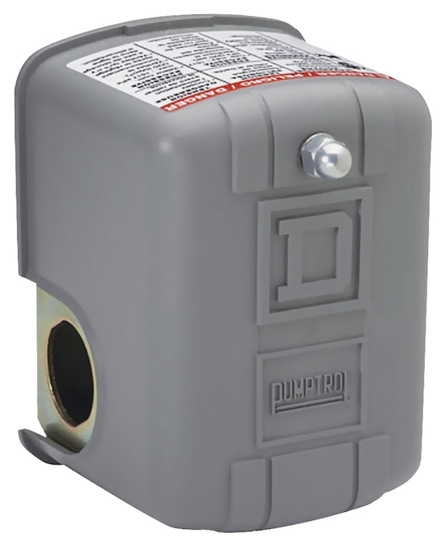 Water pump and air compressor pressure switch with 20 to 40 psi cut-in/cut-out settings. Designed to control higher water pumps and air compressors requiring higher electrical ratings. 2-Pole, NEMA 1 enclosure, 1/4 in NPSF internal pressure connection, diaphragm actuated, UL/CSA Listed, RoHS compliant, NSF61-Annex G certified. Individually boxed.