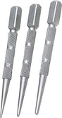 Made of hardened and tempered alloy steel with square head. Round knurled body. Tips are cupped and chamfered. Square head prevents rolling. 4 in long. Set contains 1/32 in, 1/16 in and 3/32 in nails.
