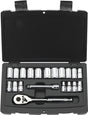 - Includes: (18) Drive Sockets (1/4 in) (1) 1/4 in Drive Extension Bar (3 in) (1) 1/4 in Ratchet (1) Blow Molded Carrying Case
