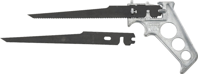 The 4-Way keyhole saw is quite versatile and can cut curves, circles and frets in places where ordinary hacksaws cannot reach. This lightweight, pistol grip handle comes with one 7 in x 9 TPI wood-cutting blade and one 7 in x 24 TPI metal-cutting blade allowing you to cut wood, nails, composition board, BX cable, conduit and more.