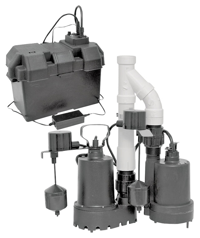 - Includes: 0.3 hp Sump Pump 12 VDC Back-Up Pump (2) 1-1/2 in Check Valves Pipe and Fittings
