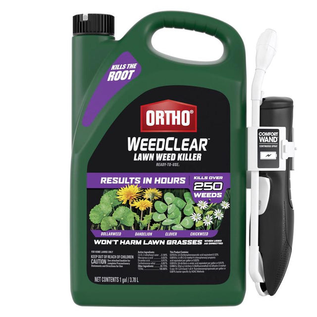 Kill weeds down to the root without harming your lawn (when used as directed)! Ortho WeedClear Lawn Weed Killer Ready-To-Use1 controls and suppresses over 250 types of weeds, including major broadleaf weeds (see label for list), dandelion, clover, oxalis, chickweed, and spurge, yet won't damage your grass (when used as directed). The formula is rainproof in hours and delivers visible results in 24 hours. The liquid herbicide enters through leaves and moves inside the weed down to the roots. To use, install the battery-powered Ortho Comfort Wand from the side of the bottle to easily reach and spot-treat weeds with a continuous stream - no bending or pumping required! Best to apply when weeds are young and actively growing. Recommended for use on multiple lawn varieties including Kentucky bluegrass, perennial ryegrass, fescues, common bermudagrass, hybrid bermudagrass, bahiagrass, bentgrass, buffalograss, centipedegrass, zoysiagrass, and St. Augustinegrass (except Floratam).