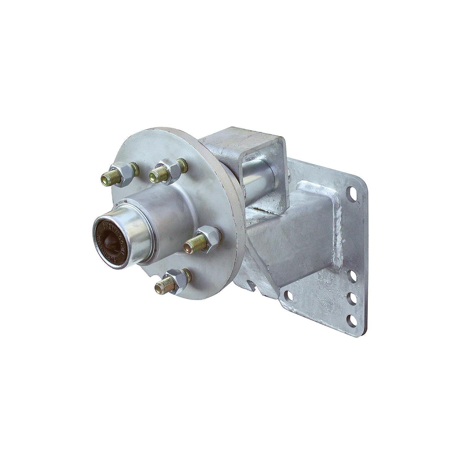 Heavy duty steel carrier mounts spare hub/torsion spindle and spare tire. Hot dip galvanized for lasting protection. Designed for use with Eliminator Torsion Axles. Includes 5 stud pre-greased 1,750# hub with 1-1/16 and 1-3/8" bearings. Fits all trailer frames up to 5" high.