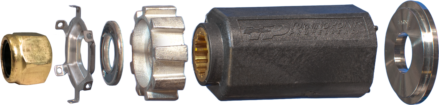 Turning Point's MasterGuard Hubs are engineered to withstand typical wear and tear over time without risk of spinning or failure under normal operational use. Turning Point's unique patented one piece hub with glass filled nylon over durable marine bronze splines eliminates failures commonly seen in multi-part "sleeve and spline" designs, and pressed-in rubber hub systems.