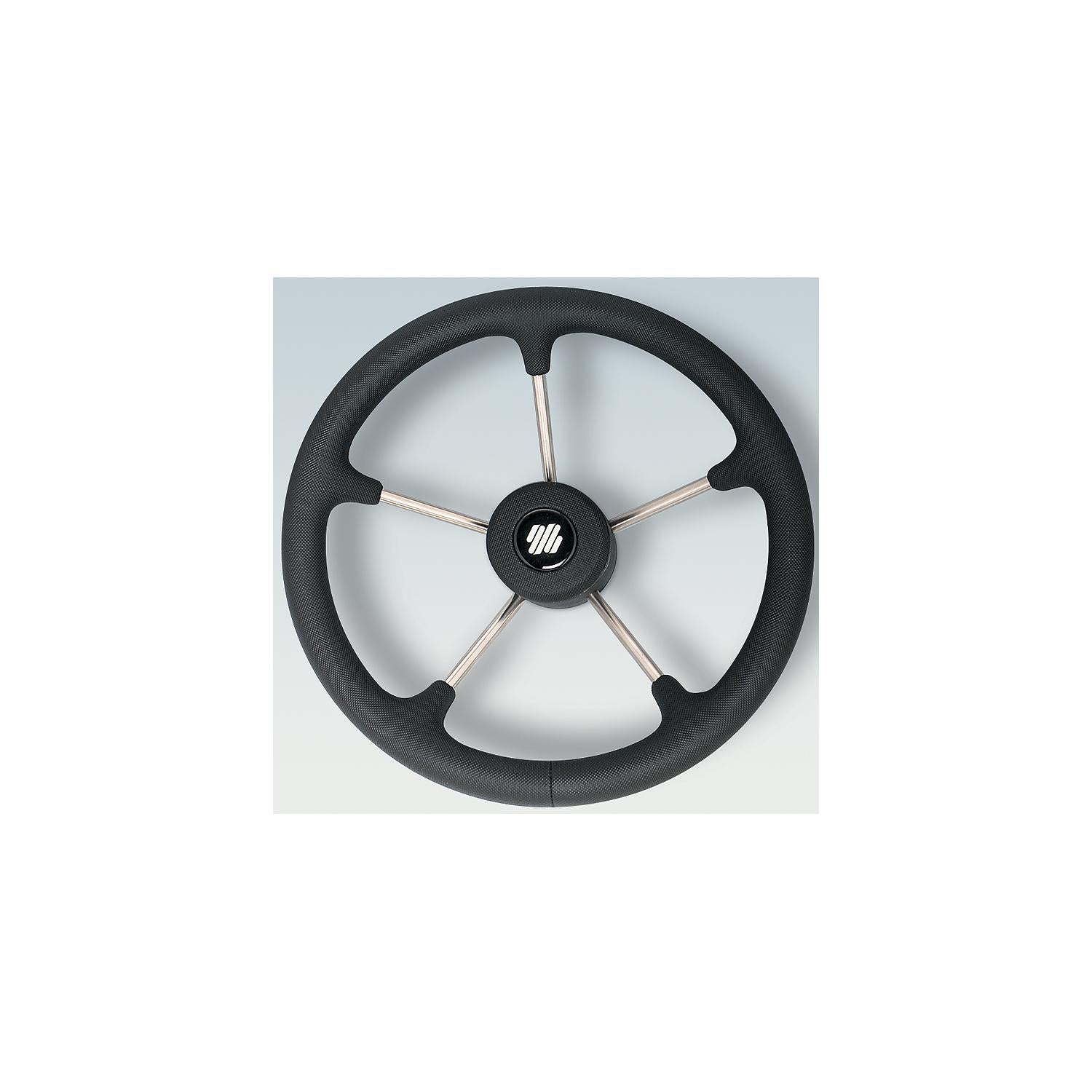 High quality 304 Stainless Steel 5 spoke steering wheel featuring welded spokes and hub. 3/4" tapered shaft fits nearly every steering helm in the market.