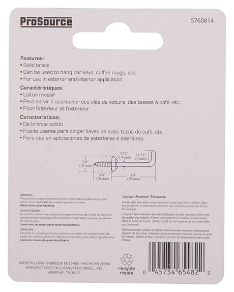 ProSource 20008SPB-PS Shoulder Hook, 11/32 in Opening, 3 mm Thread, 1-1/8 in L, Brass, Brass