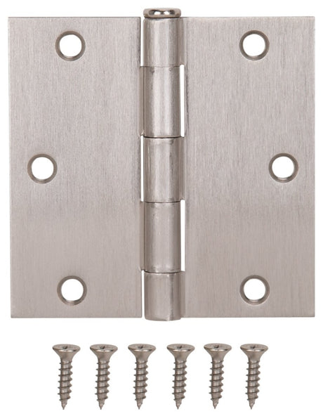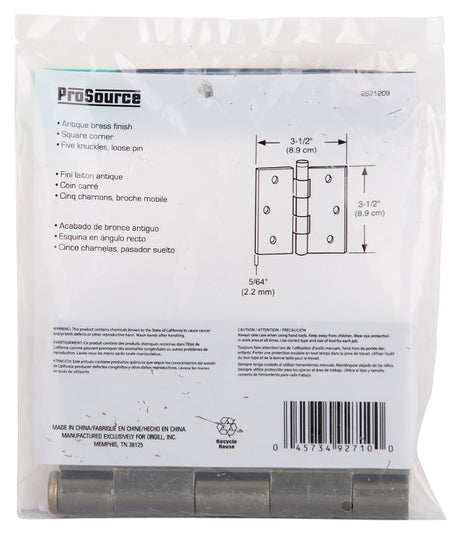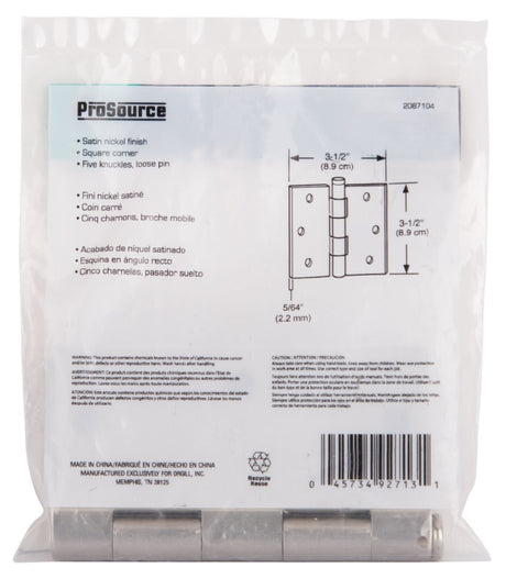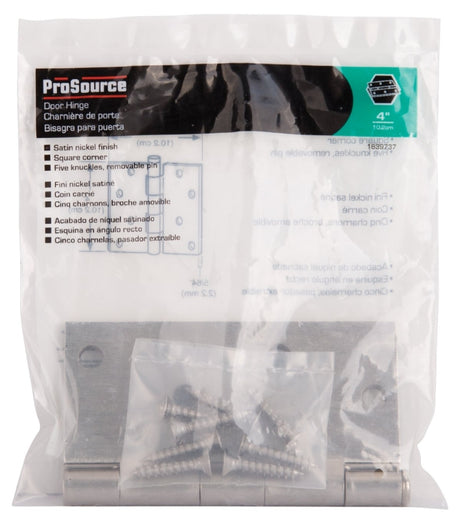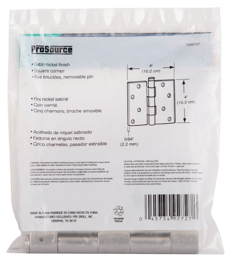 ProSource 20339SNX Square Corner Door Hinge, Steel, Satin Nickel, Loose Pin, 180 deg Range of Motion