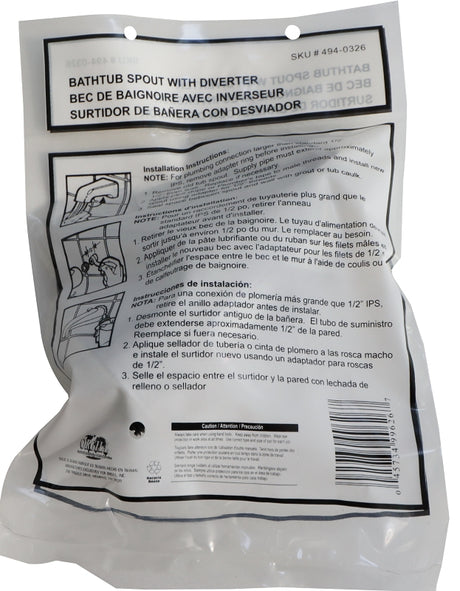 ProSource 24500 Bathtub Spout, 5-1/8 in L, 3/4 x 1/2 in Connection, IPS, Zinc, Chrome Plated