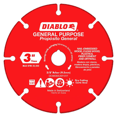 Diablo DCW030CAR101F Cut-Off Wheel, 3 in Dia, 1.8 mm Thick, 3/8 in Arbor, Carbide Abrasive