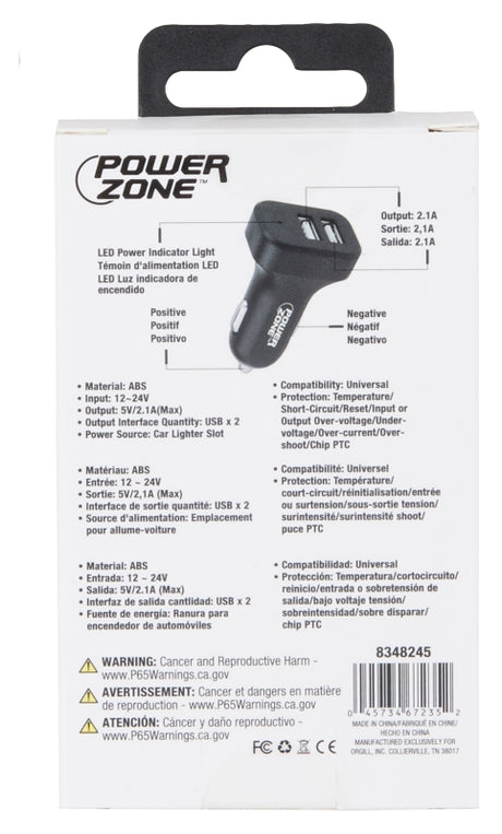 PowerZone U53 Dual USB Car Charger, 12 to 24 V Input, 5 V Output, 2.4 A Charge, Black