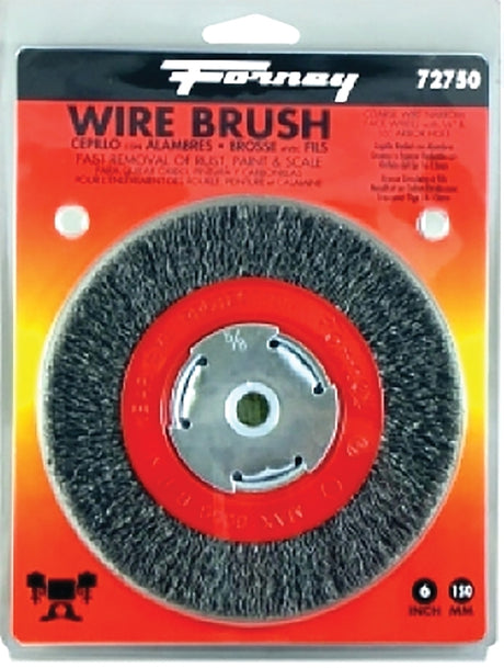 Forney 72750 Wire Bench Wheel Brush, 6 in Dia, 1/2 to 5/8 in Arbor/Shank, 0.014 in Dia Bristle