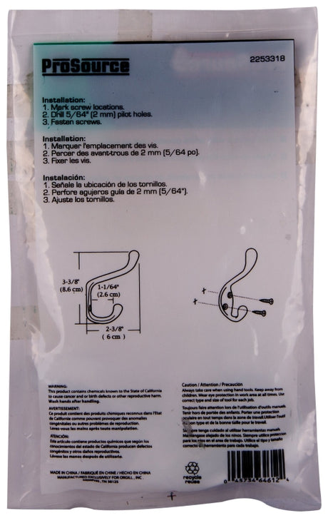 ProSource H6721007W-PS Coat and Hat Hook, 22 lb, 2-Hook, 1-1/64 in Opening, Zinc