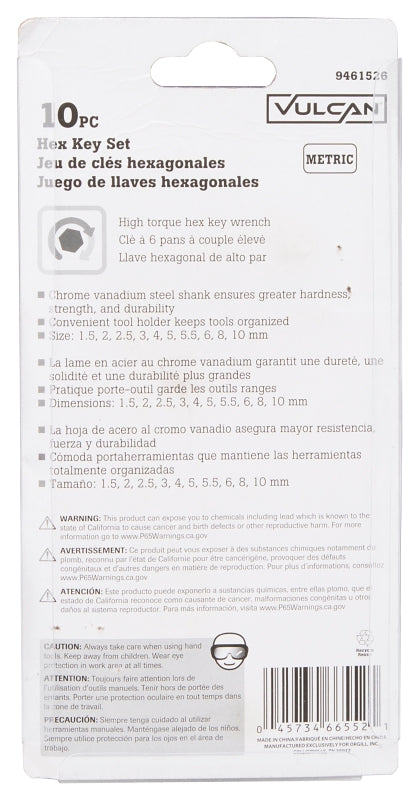 Vulcan TW-001-45M Hex Key Set, 9-Piece, Chrome Vanadium Steel, Black