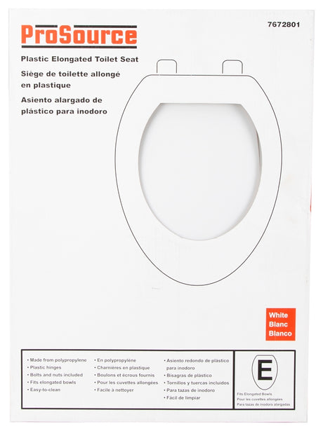 ProSource KJ-873A1-WH Toilet Seat, Elongated, Plastic, White, Plastic Hinge
