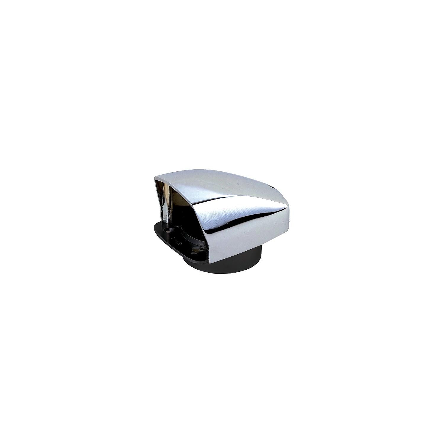 Chrome plated zinc. 3" duct threads into neck. Hose clamps not required. Cowl/Mouth opening is 7-1/3". Screw size is #10.