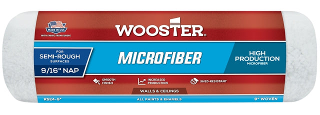 Made using a high-capacity and shed-resistant European fabric, Wooster microfiber rollers are the perfect choice for painters looking for a high-production microfiber cover. Although they are designed for use with all paints, stains and enamels, these rollers excel in lower sheen applications. New Wooster microfiber rollers also have reduced spatter when compared to like fabrics.