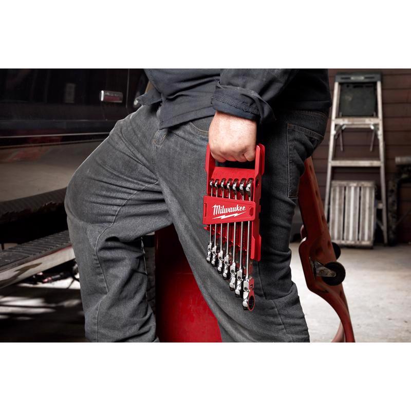 The Milwaukee SAE Flex Head Ratcheting Combination Wrench Set features 2.5 degrees of arc swing and 144 ratcheting positions, allowing quick and efficient work in tight spaces. The flex head wrenches have double-stacked pawls within the ratcheting mechanism, which increases durability and extends the life of the tools. The flexible head gives you increased accessibility in difficult-to-reach areas. The MaxBite Open-End Grip improves the wrench's grip on nuts and bolts, offering you 25 percent more torque than smooth-faced wrenches. This flex head wrench set feature ergonomic I-Beam handles designed for improved comfort and ink-filled size labels for easy size identification and quick distinction between SAE and metric sets. The 7 pc kits come in a portable, locking storage tray, offering organization both on and off the jobsite.