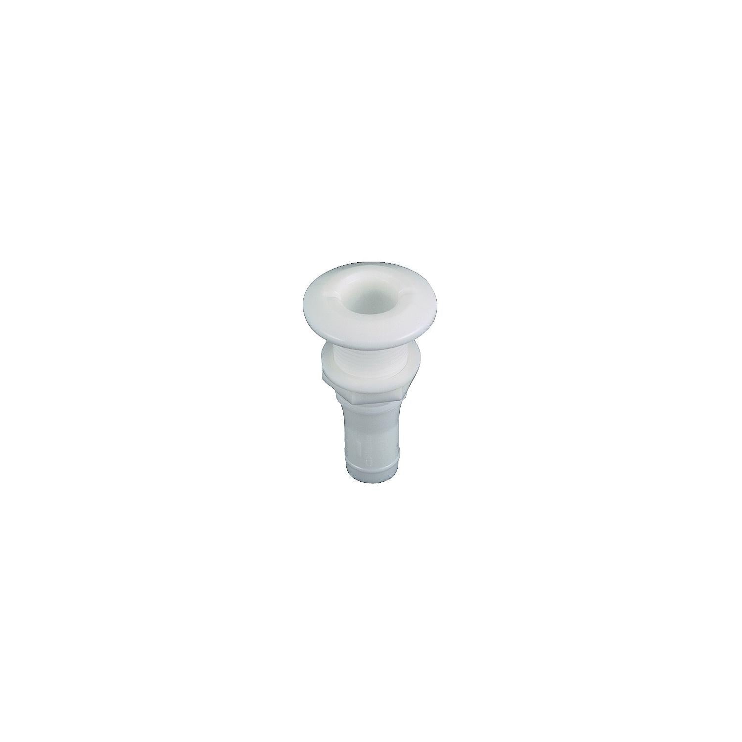 Molded white plastic with broad flange. For use with hose. Not recommended for use below waterline.
