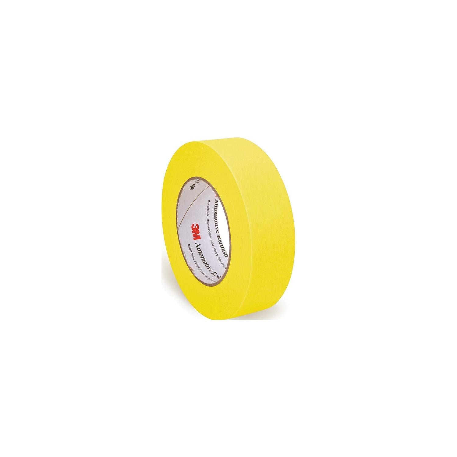 Yellow crepe paper tape with proprietary rubber-based adhesive delivers instant adhesion to all vehicle surfaces, has good holding power that allows for fast and efficient application. The specially-treated paper backing offers solvent and moisture resistance that minimizes bleed through; it also delivers a controlled unwind that makes tape easier to handle. The semi-smooth backing is thin and conformable so it produces sharp, clean, quality paint jobs. Sticks, stays and removes cleanly. Waterborne paint compatible.
