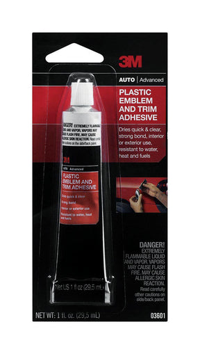 Strong gripping power with resistance 3M plastic emblem and trim adhesive is a solvent-based adhesive that resists environmental exposure such as water and heat to maintain a solid bond. Made to dry clear, the adhesive can be used to bond transparent or translucent plastics. Easy to use, quick acting. Our adhesive is easily applied directly to surfaces from the tube. This single-component trim adhesive is ready to use without any mixing. Simply apply to a clean surface and then let dry. A quick-acting formula, this adhesive has a working time of approximately 10 to 30 seconds, sets in approximately 15 minutes and fully cures in 24 hours. The fast-acting formula is perfect for affixing trim. A strong bond on challenging surfaces. Applying metal and plastic emblems and trim requires an adhesive that creates a permanent bond that won't loosen over time. 3M plastic emblem and trim adhesive is made to create permanent adhesion between dissimilar and non-porous materials such as plastic and fully cured painted automotive surfaces, making it a popular choice for affixing emblems and trim on vehicles.