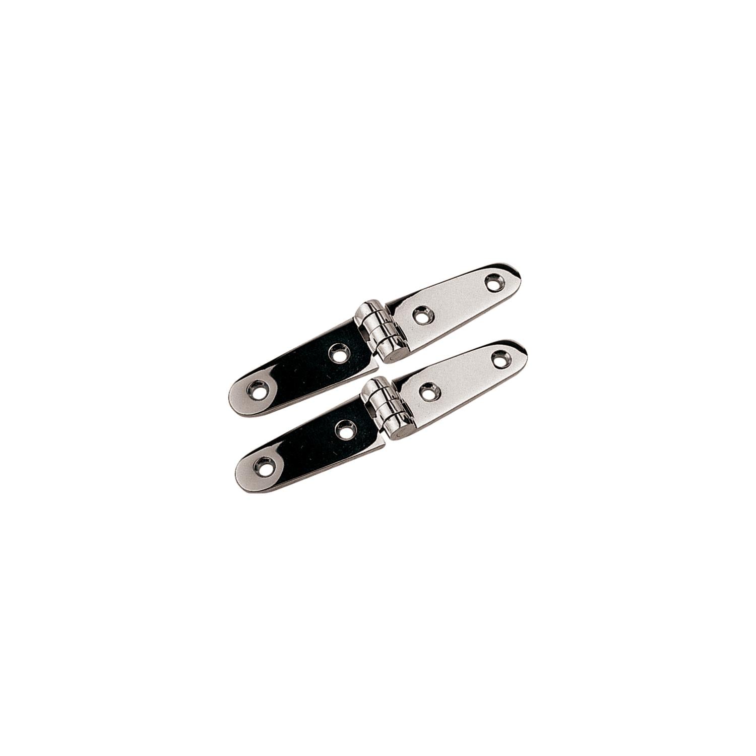 Consisting of two long narrow leaves extending from a single knuckle, strap hinges are commonly used for surface mounting dock box lids, fish holds, etc. Constructed of corrosion resistant 316 stainless steel. Good for outdoor applications where the hinges will be in frequent use. Installs with #8 fasteners (not included).