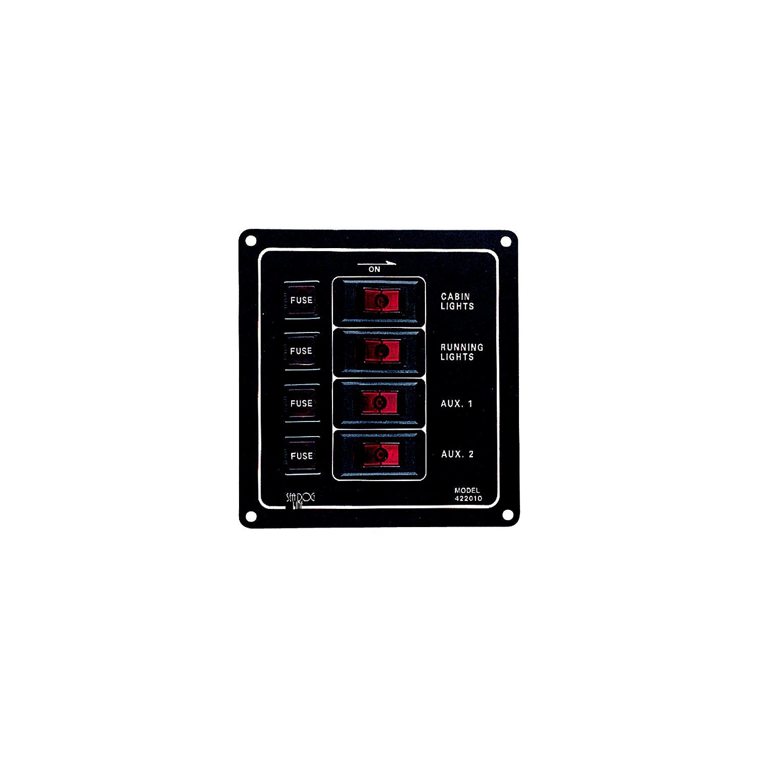 Aluminum Vertical Rocker Switch Panel is constructed of stamped anodized aluminum. Features four 15A 12VDC illuminated SPST On/Off rocker switches and four 10A 12VDC fuse holders. Individual circuit 10A max. 37A total. 12VDC. Includes a sheet of 20 preprinted decals to customize to your specific applications. Installs with four #6 RH fasteners (not included).
