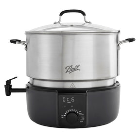 Free up time and space on the stovetop with the Ball EasyCanner. Just fill the freestanding canning pot with water and jars of your favorite canning recipes, set the timer, and relax as it takes care of the rest. The pre-programmed Press and Forget technology automates preheating and processing steps with heat sensors that maintain optimal temperatures for consistent results every time while eliminating the time-consuming need to watch the pot. The 21 qt capacity fits up to 8 pint-size or 7 quart-size jars. When finished, use the spigot for mess-free draining into your sink, and add the lid, rack, and steam tray to the dishwasher for easy cleaning; pot is hand-wash only. Comfortable handles make it easy to lift and tuck away when not in use. Plus, canner includes multi-cooker and steamer functionality that's perfect for cooking pastas, soups, vegetables and seafood, making it the essential all-in-one tool for new and experienced canners alike.