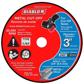 Diablo DBD030045105F Cut-Off Disc, 3 in Dia, 0.045 in Thick, 3/8 in Arbor, Aluminum Oxide Abrasive