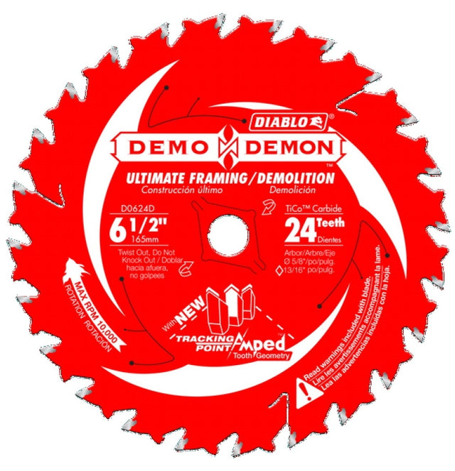 Diablo Demo Demon Amped D0624DA Circular Saw Blade, 6-1/2 in Dia, 5/8 in Arbor, 24-Teeth