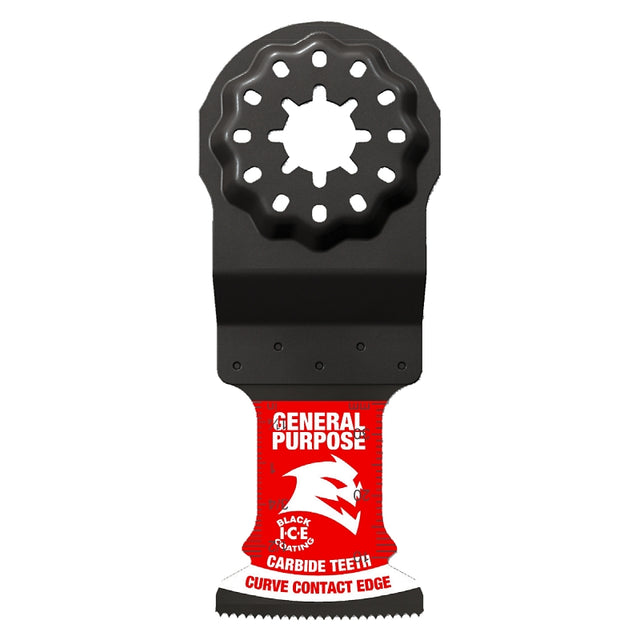 Diablo's Starlock carbide oscillating blades feature application specific designs that deliver extreme durability and superior cutting life in general purpose cuts: nail-embedded wood, clean wood, metal and plastics. High-performance carbide teeth deliver an unmatched up to 50X longer cutting life versus standard bi-metal blades. Curve contact edge creates a pilot for precise, clean plunge cuts with less vibration. An optimized blade design and Black I.C.E. (Industrial Cooling Element) keeps the teeth cool and build Up-free for fast, clean cuts. Tool-free quick-change interface fits Fein and other starlock tools, also compatible with non-starlock multi-tools.
