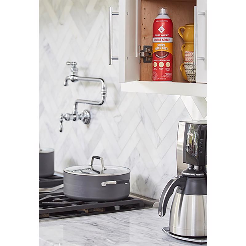 Unattended cooking is the number one of cause of home fires. Equip your kitchen with First Alert's EZ Fire Spray to help be prepared. It discharges four times longer than a regular fire extinguisher, making it effective against common household fires including grease fires. The portable size and aerosol spray nozzle make using this product fast and simple for at home, on boats, RVs, and while traveling.