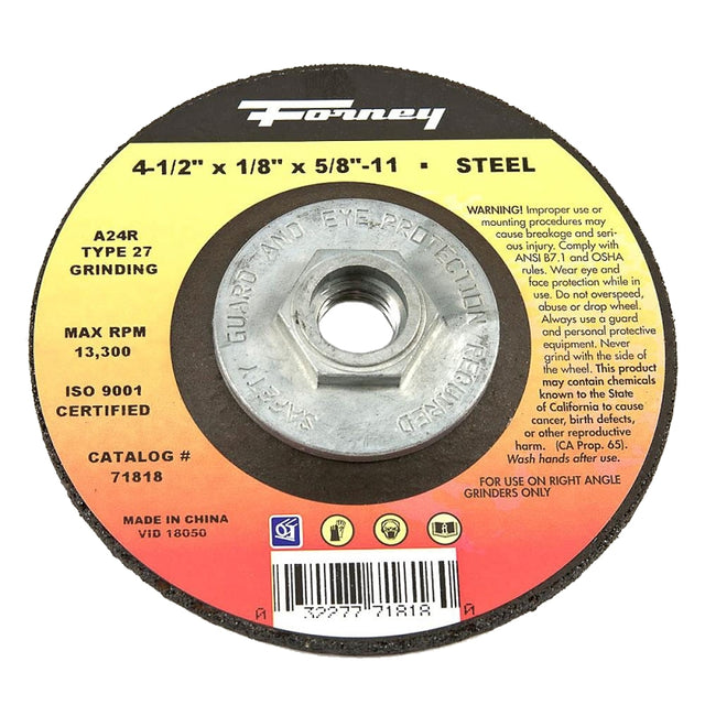 Forney Grinding Wheel, Type 27, 4-1/2 in Dia, 1/8 in Thick, Arbor Size: 5/8-11 in, Aluminum Oxide/Metal Abrasive, 13,300 rpm, Applicable Materials: Ferrous Material, Suitable for: Angle Grinder