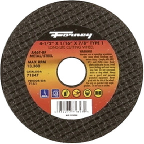 Forney 71847 Cut-Off Wheel, 4-1/2 in Dia, 1/16 in Thick, 7/8 in Arbor, 46 Grit, Medium, Aluminum Oxide Abrasive