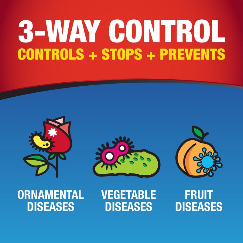 3-way control - controls/stops and prevents over 75 diseases including tomato blight, anthracnose, fusarium wilt, mold, powdery mildew and more