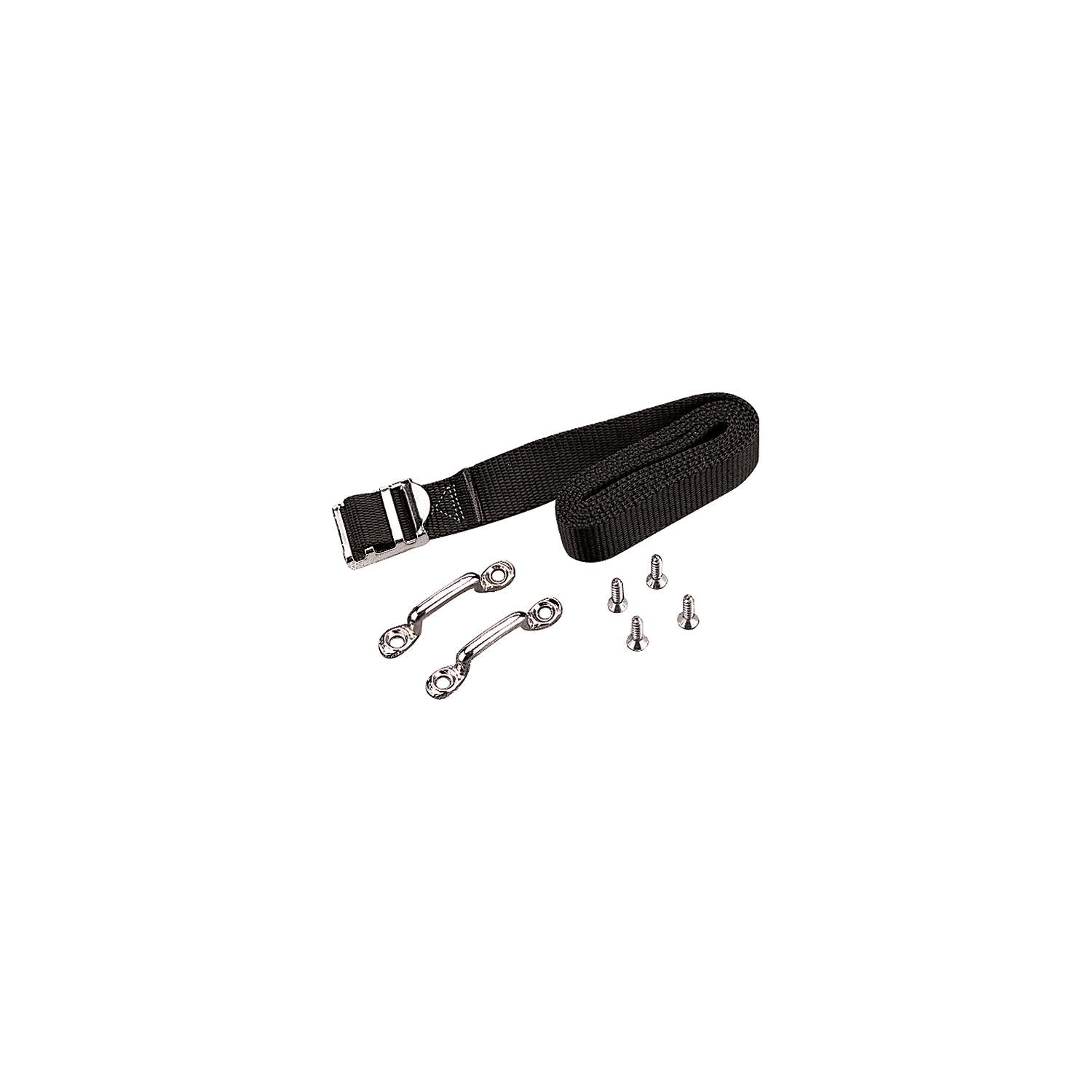 Heavy Duty Battery Box Strap includes a woven polypropylene strap, stainless steel buckle, two chrome plated brass brackets, and four #8 FH fasteners.