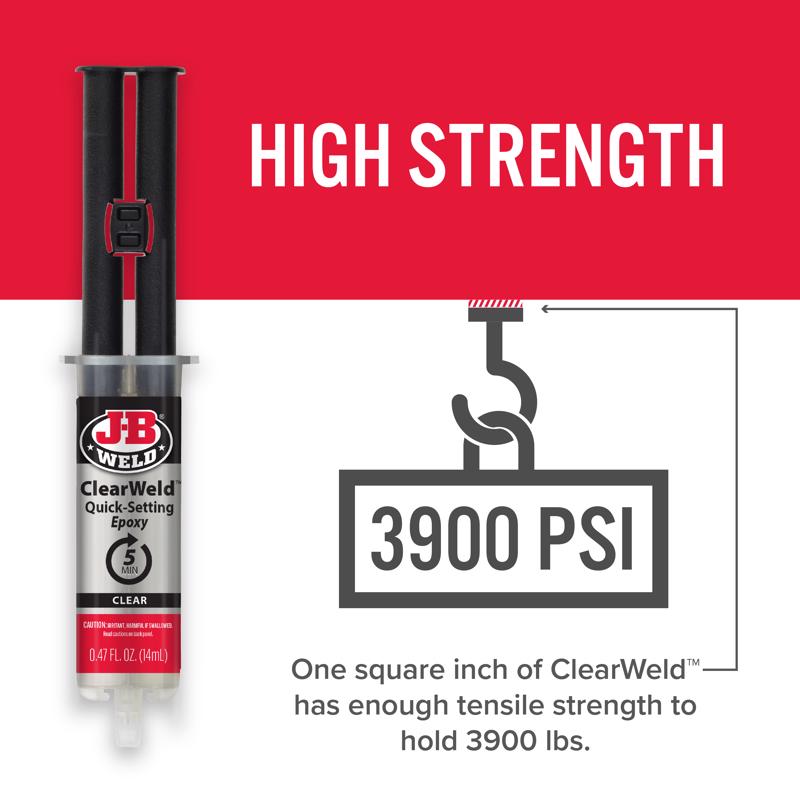 J-B Weld ClearWeld Syringe is a quick setting, multipurpose two part epoxy that provides a strong and lasting bond on most surfaces including tile, most plastics, ceramic, glass, wood and metal. ClearWeld is designed to cure with a clear, transparent bond when used at thicknesses of less than 15 mil. ClearWeld has a 1:1 mixing ratio, sets in 5 minutes and cures in 1 hour. With a tensile strength of 3900 PSI, ClearWeld sets to a hard, permanent bond.