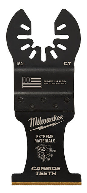 Our universal fit OPEN-LOK titanium enhanced carbide teeth extreme materials blades for oscillating multi-tools are designed for use in the most Extreme material cutting applications. For use in wood, screws, nails, cement board, plaster and other cutting applications, the titanium enhanced carbide teeth extreme materials blade is complete with a thinner blade and unique aggressive tooth design that offers faster cutting performance in wood when compared to the standard carbide blade. The extreme materials carbide teeth blade lasts up to 50X longer than standard bi-metal blades and can be used in a wide range of materials. These Milwaukee multi-tool blades are designed and made in the USA with global materials.