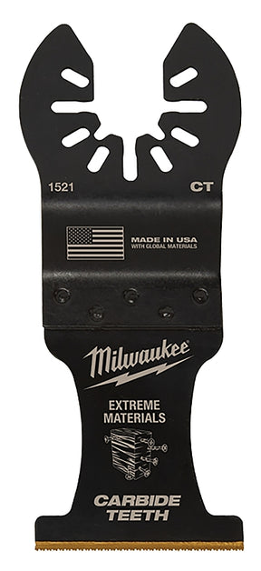 Our universal fit OPEN-LOK titanium enhanced carbide teeth extreme materials blades for oscillating multi-tools are designed for use in the most Extreme material cutting applications. For use in wood, screws, nails, cement board, plaster and other cutting applications, the titanium enhanced carbide teeth extreme materials blade is complete with a thinner blade and unique aggressive tooth design that offers faster cutting performance in wood when compared to the standard carbide blade. The extreme materials carbide teeth blade lasts up to 50X longer than standard bi-metal blades and can be used in a wide range of materials. These Milwaukee multi-tool blades are designed and made in the USA with global materials.