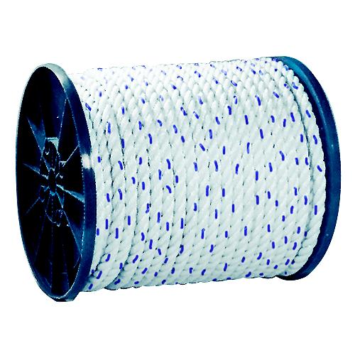 Manufactured from 100% filament nylon fibers. Has great elasticity properties and the ability to absorb sudden shock loads. Excellent resistance to abrasion, rot, mildew, oil, grease, gasoline, acids and most chemicals. White with contrasting blue tracer.