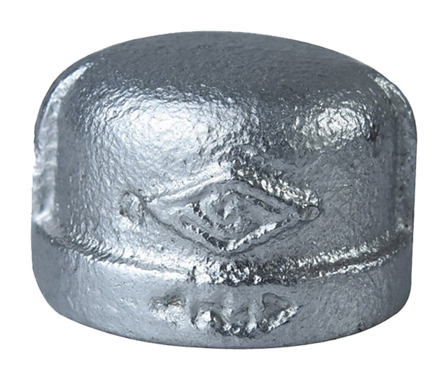 The galvanized cap is a class 150 malleable iron pipe fitting that is used for closing and terminating the male end of a pipe or fitting.