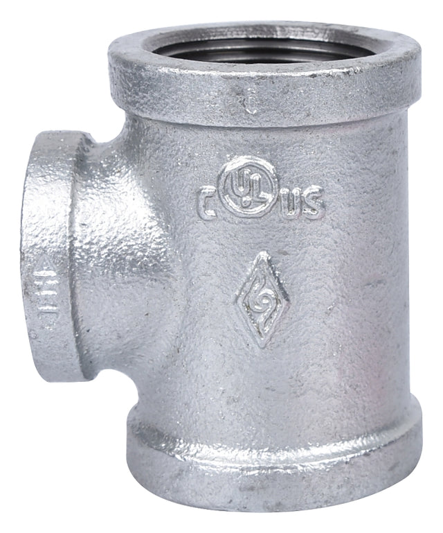 This galvanized tee is used to change direction in piping for use with water or steam. It meets ANSI standard with flat banded, right hand threads standard screw.