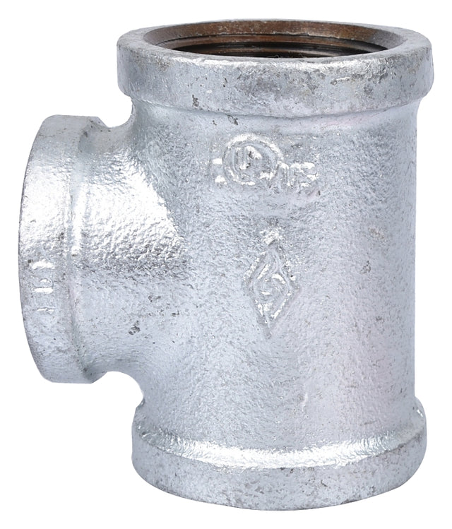 This galvanized tee is used to change direction in piping for use with water or steam. It meets ANSI standard with flat banded, right hand threads standard screw.