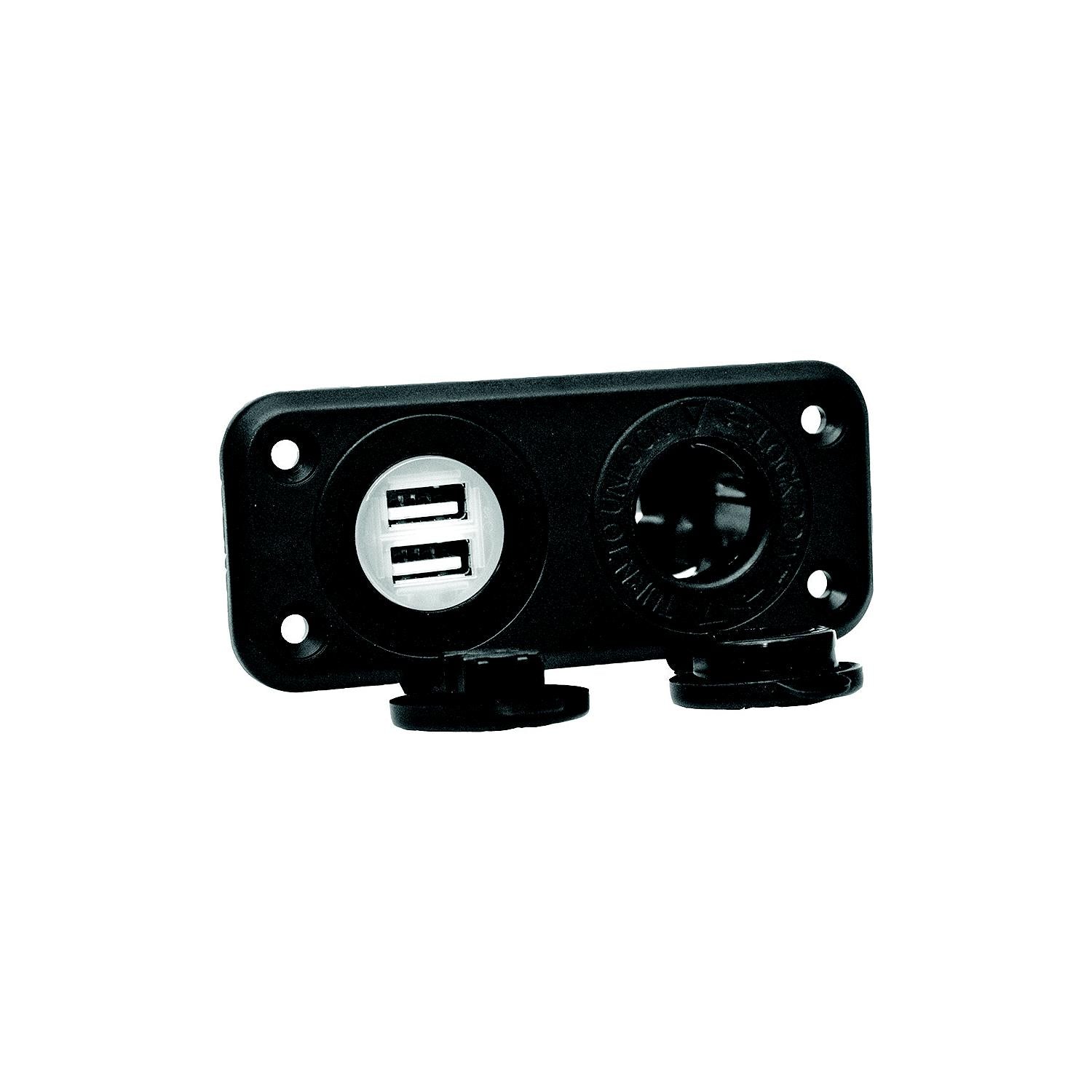 12 Volt receptacle with dual 2.1 amp USB ports. Complete with mounting plate and dust cover. Charges most mobile devices.